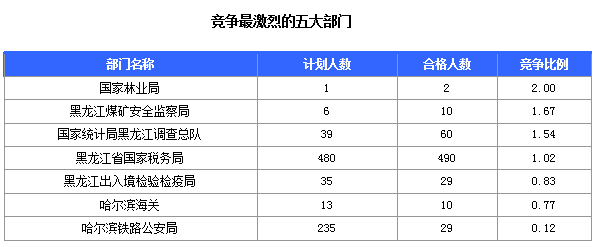 截止15日17時(shí),招錄比例的職位為黑龍江省國家稅務(wù)局齊齊哈爾市富拉爾基區(qū)國家稅務(wù)局科員一職,招錄2人,通過人數(shù)48人,競爭比24:1。
