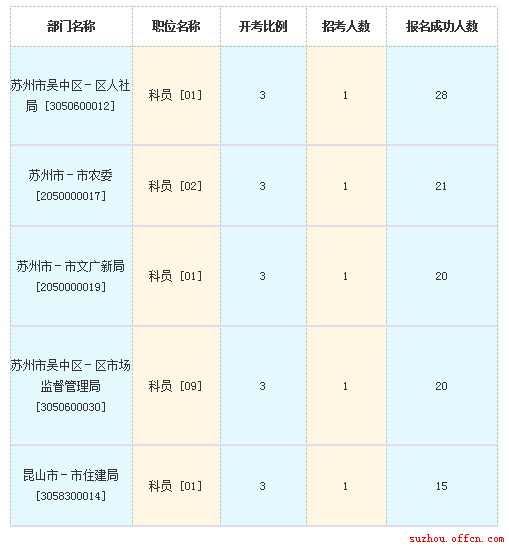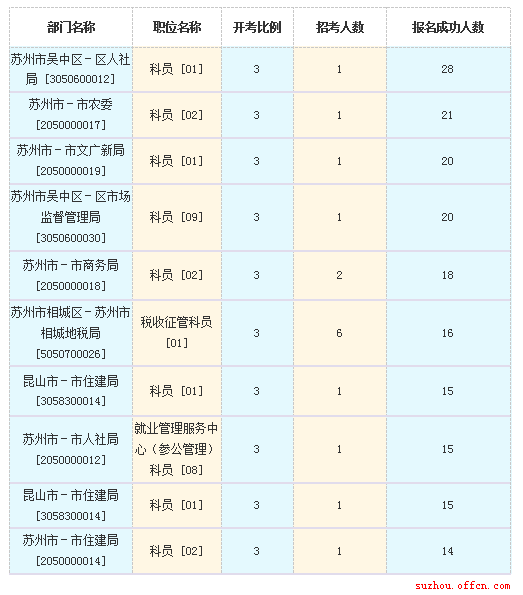 截至12日16時,蘇州市報名人數(shù)最多的職位為:蘇州市吳中區(qū)-區(qū)人社局科員 [01],一共有28人報名,競爭最激烈的職位也是蘇州市吳中區(qū)-區(qū)人社局科員 [01],招錄1人,報名人數(shù)為28人,報名通過審核人數(shù)前十的職位主要集中在蘇州市吳中區(qū)-區(qū)人社局 [3050600012]、蘇州市市農(nóng)委[2050000017]和市文廣新局[2050000019]、吳中區(qū)市場監(jiān)督管理局[3050600030]、相城地稅局[5050700026]等部門,具體信息如下: