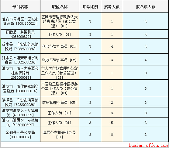 截至11日16時,淮安市報名人數(shù)最多的職位為:區(qū)城市管理行政執(zhí)法大隊執(zhí)法隊員(參公管理) [01]、稅收征管辦事員 [01]、稅收征管辦事員 [02]、工作人員 [09],分別有4人報名,競爭最激烈的職位為工作人員 [09],招錄1人,報名人數(shù)為4人,報名通過審核人數(shù)前十的職位主要集中在淮安市清浦區(qū)-區(qū)城市管理局 [3081100021]、漣水縣-淮安市漣水地稅局 [5082600026],具體信息如下: