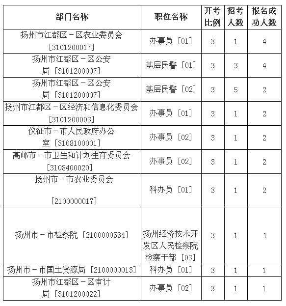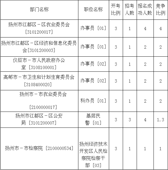 截至11日16時,揚州市報名人數(shù)最多的職位為:揚州市江都區(qū)-區(qū)農(nóng)業(yè)委員會[3101200017]辦事員[01],一共有4人報名,競爭最激烈的職位為揚州市江都區(qū)-區(qū)農(nóng)業(yè)委員會[3101200017]辦事員[01],招錄1人,報名人數(shù)為4人,報名通過審核人數(shù)前十的職位主要集中在揚州市江都區(qū)-區(qū)公安局 [3101200007]、揚州市-市農(nóng)業(yè)委員會[2100000017],具體信息如下: