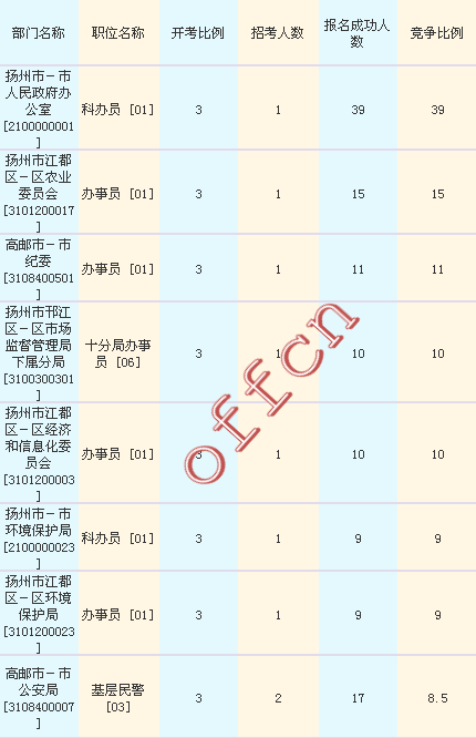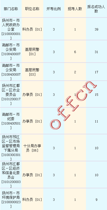截至12日16時,揚州市報名人數(shù)最多的職位為: 揚州市-市人民政府辦公室 [2100000001]科辦員 [01],一共有39人報名,競爭最激烈的職位為揚州市-市人民政府辦公室 [2100000001]科辦員 [01],招錄1人,報名人數(shù)為39人,報名通過審核人數(shù)前十的職位主要集中在高郵市-市紀委 [3108400501],揚州市邗江區(qū)-區(qū)市場監(jiān)督管理局下屬分局 [3100300301],具體信息如下: