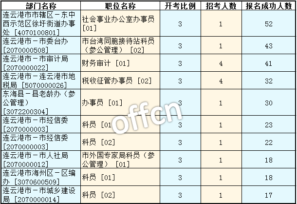 截至13日16時,連云港市報名人數(shù)最多的職位為:社會事業(yè)辦公室辦事員 [01],一共有52人報名,同時也是競爭最激烈的職位,報名通過審核人數(shù)前十的職位主要集中在連云港市市轄區(qū)-東中西示范區(qū)徐圩街道辦事處 [4070100801]、連云港市-市委臺辦 [2070000508],具體信息如下:
