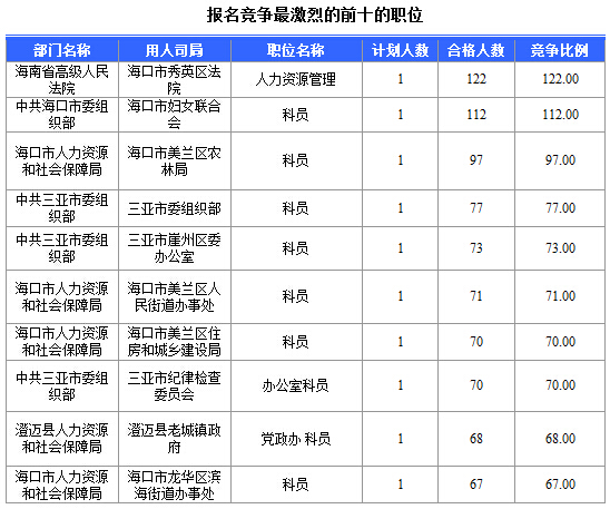 截止16日16時(shí),招錄比例的職位為海南省高級(jí)人民法院??谑行阌^(qū)法院人力資源管理一職,招錄1人,截止16日16時(shí)通過(guò)人數(shù)為122人。