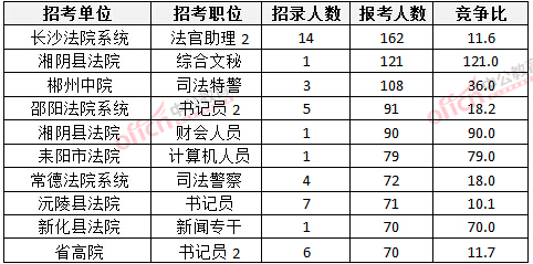 為幫助廣大考生更清晰的了解報(bào)名情況,湖南中公網(wǎng)校整理了湖南法院系統(tǒng)各職位的報(bào)名人數(shù)排名以及競(jìng)爭(zhēng)比例排名,供廣大考生參考: