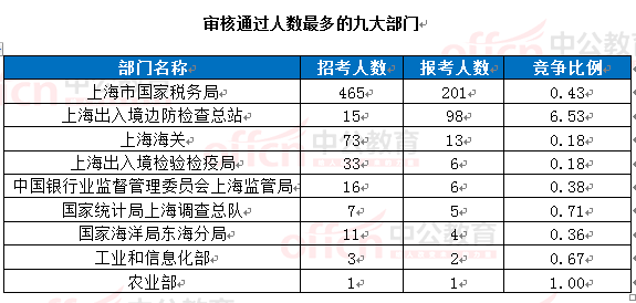 為幫助廣大考生更清晰的了解今日?qǐng)?bào)名情況,上海中公網(wǎng)校整理了審核通過(guò)人數(shù)前十位的部門以及競(jìng)爭(zhēng)比例最激烈的十大部門,供廣大考生參考:
