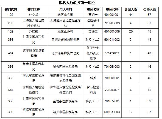 報名首日的人氣前十榜單涵蓋了外交部、國稅、出入境邊防檢查總站、遼寧儲備物資管理局等各個部門,其中,外交部地區(qū)業(yè)務(wù)司英語一(職位代碼401001001),上海出入境邊防檢查總站邊檢站科員(職位代碼723263003)這兩個職位目前均擁有了67個“粉絲”,可謂首日的“人氣雙星”,外交部地區(qū)業(yè)務(wù)司英語一(職位代碼401001001)這一職位招錄44人,規(guī)模較大,且英語屬于大語種,符合條件的考生較多。