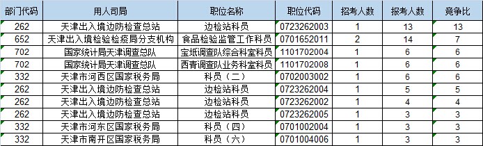 報(bào)名通過審核人數(shù)前十的職位主要集中在天津出入境檢驗(yàn)檢疫局分支機(jī)構(gòu)、天津出入境邊防檢查總站、國(guó)家統(tǒng)計(jì)局天津調(diào)查總隊(duì),具體信息如下: