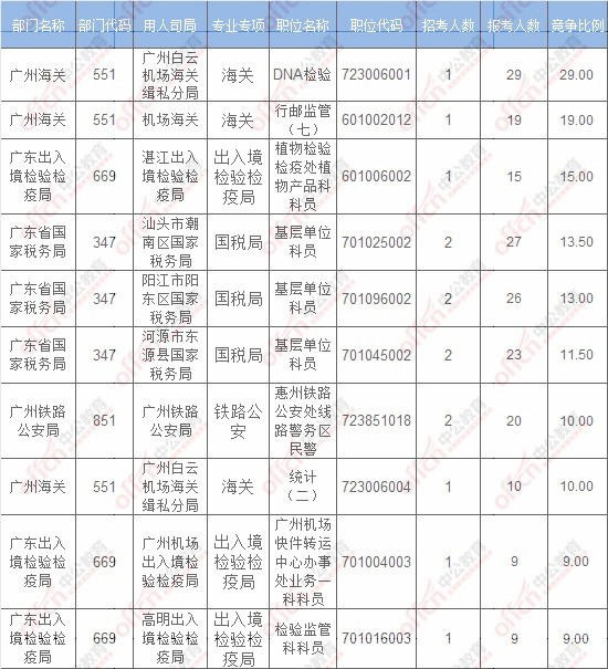 截止到15日16時(shí),競(jìng)爭(zhēng)比例的職位為廣州海關(guān)廣州白云機(jī)場(chǎng)海關(guān)緝私分局DNA檢驗(yàn)一職,招錄1人,截止到15日16時(shí)通過人數(shù)為29人。