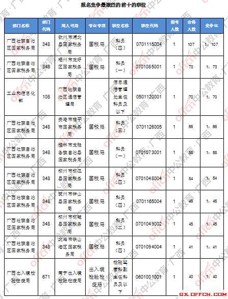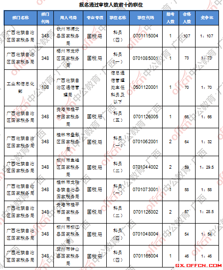報(bào)名通過審核人數(shù)前十的職位主要集中在廣西壯族自治區(qū)國家稅務(wù)局、工業(yè)和信息化部等部門,具體信息如下:
