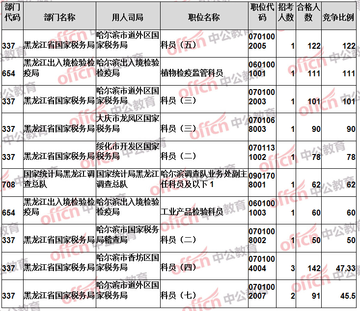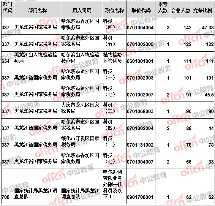 報(bào)名通過審核人數(shù)前十的職位主要集中在黑龍江省國家稅務(wù)局、黑龍江出入境檢驗(yàn)檢疫局、國家統(tǒng)計(jì)局黑龍江調(diào)查總隊(duì)等部門,具體信息如下: