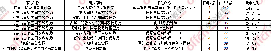 報名通過審核人數(shù)前十的職位主要集中在內(nèi)蒙古儲備物資管理局、內(nèi)蒙古固陽縣國家稅務(wù)局、內(nèi)蒙古土默特右旗國家稅務(wù)局等部門,具體信息如下: