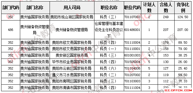 報(bào)名通過(guò)審核人數(shù)較多的職位主要集中在貴州省國(guó)家稅務(wù)局、貴州儲(chǔ)備物資管理局等部門(mén),具體信息如下: