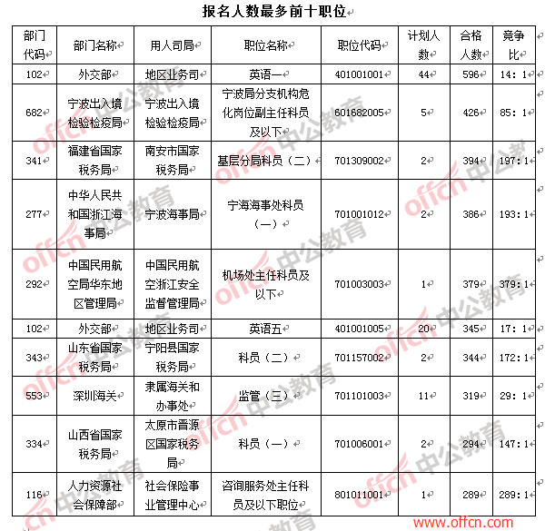 從報名人數(shù)上來看,外交部地區(qū)業(yè)務(wù)司(職位代碼401001001)的職位蟬聯(lián)“人氣”,由于此職位因計劃招錄人數(shù)為此次招錄最多,因此,報名人數(shù)在短時間內(nèi)“暴漲”也是在情理之中,可以預(yù)計,此職位會成為今年眾多職位中最閃亮的“人氣之星”,與去年同期,報名人數(shù)最多的職位有888人相比,今年的考生更趨理性,不再“積堆”報考。寧波出入境檢驗檢疫局(職位代碼601682005),也因計劃招錄5人引來426名考生的“青睞”,在報名第三日成“人氣亞軍”。而福建省國家稅務(wù)局(職位代碼701309002)一職,也由上午的排行榜中前進(jìn)了2個名次,增加45人報考。