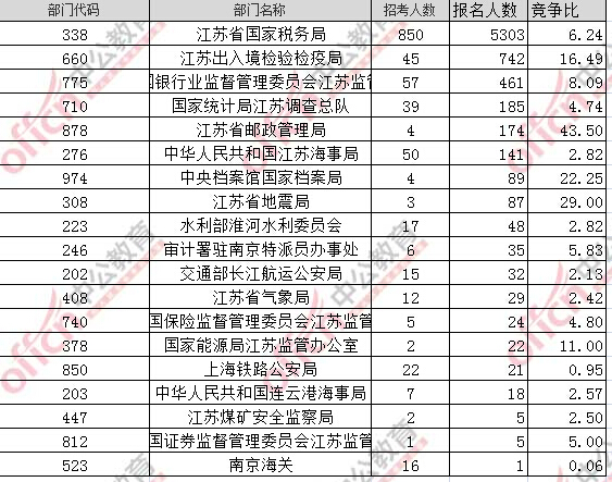 為幫助廣大考生更清晰的了解今日?qǐng)?bào)名情況,江蘇中公網(wǎng)校整理了審核通過(guò)人數(shù)前十位的部門(mén)以及競(jìng)爭(zhēng)比例最激烈的十大部門(mén),供廣大考生參考: