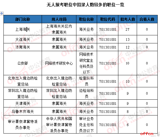 截止到18日8時,2016國考共有2805的崗位報考人數(shù)還未破零,占18%。中公網校分析,共有25個職位招錄人數(shù)在5人以上,主要分布在鐵路公安、國稅和海關系統(tǒng)。中公網校專家建議考生可以從這些職位中選取適合自己的。
