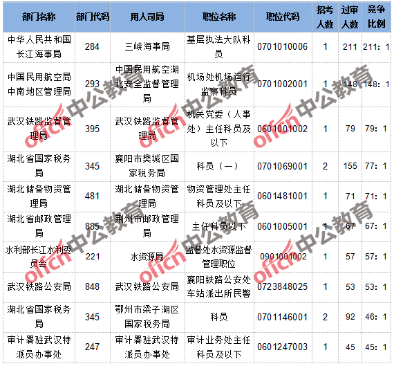 截止到10月18日8時(shí),報(bào)名通過審核人數(shù)和競(jìng)爭(zhēng)比例的職位為三峽海事局基層執(zhí)法大隊(duì)科員一職,招錄1人,過審人數(shù)211人,競(jìng)爭(zhēng)比例為211:1。具體信息如下: