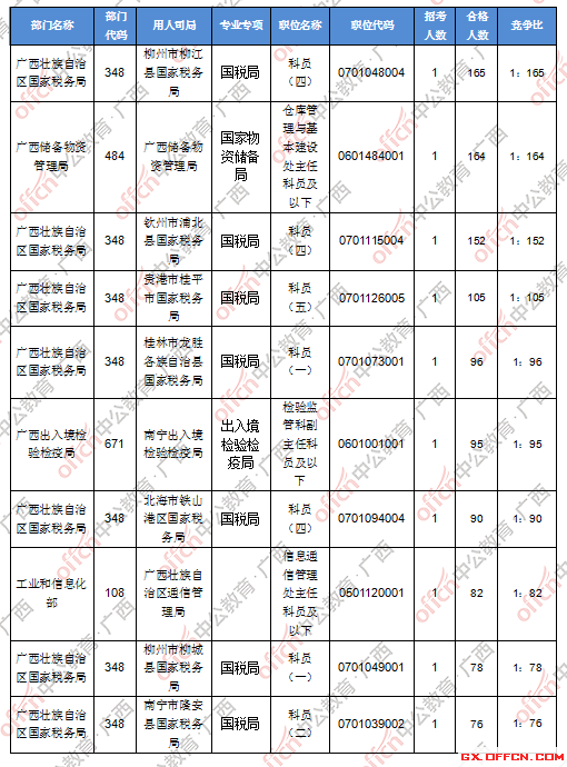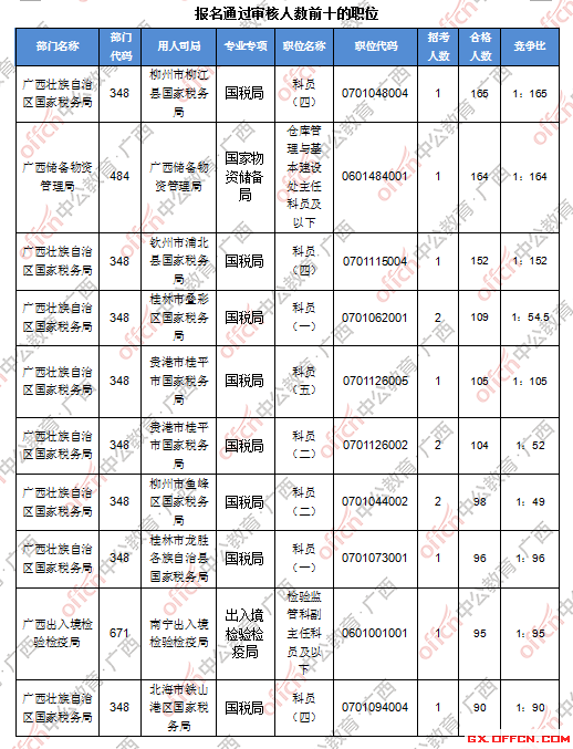 報(bào)名通過(guò)審核人數(shù)前十的職位主要集中在廣西壯族自治區(qū)國(guó)家稅務(wù)局、廣西儲(chǔ)備物資管理局、廣西出入境檢驗(yàn)檢疫局等部門,具體信息如下: