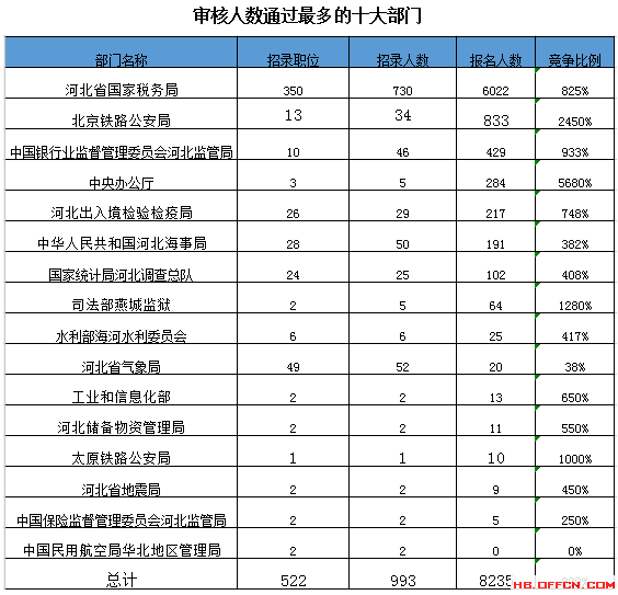 截止到18日16時,通過審核人數(shù)前三位的部門依次是:河北省國家稅務局、北京鐵路公安局、中國銀行業(yè)監(jiān)督管理委員會河北監(jiān)管局,三部門通過審核總人數(shù)達7284人,占通過審核總人數(shù)的88%。