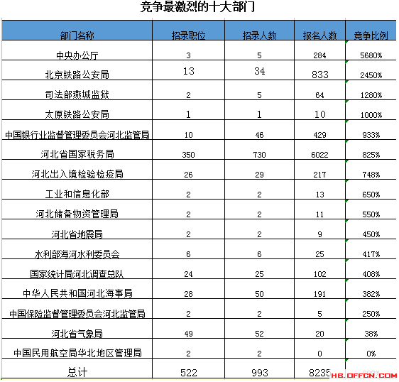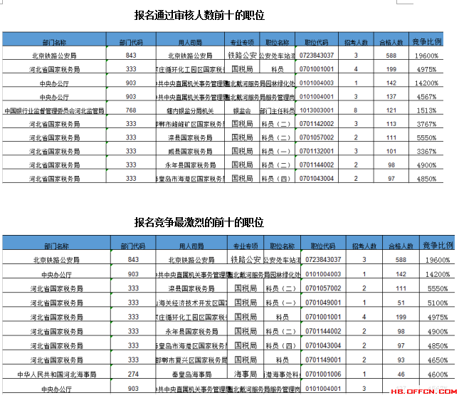 為幫助廣大考生更清晰的了解今日報名情況,河北中公網校整理了審核通過人數(shù)前十位的部門以及競爭比例最激烈的十大部門,供廣大考生參考: