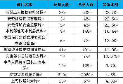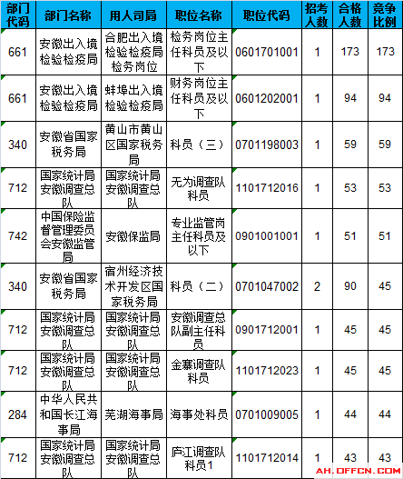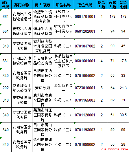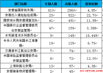 報名通過審核人數(shù)前十的職位主要集中在安徽出入境檢驗檢疫局、安徽省國家稅務(wù)局、交通部長江航運公安局這三個部門,具體信息如下: