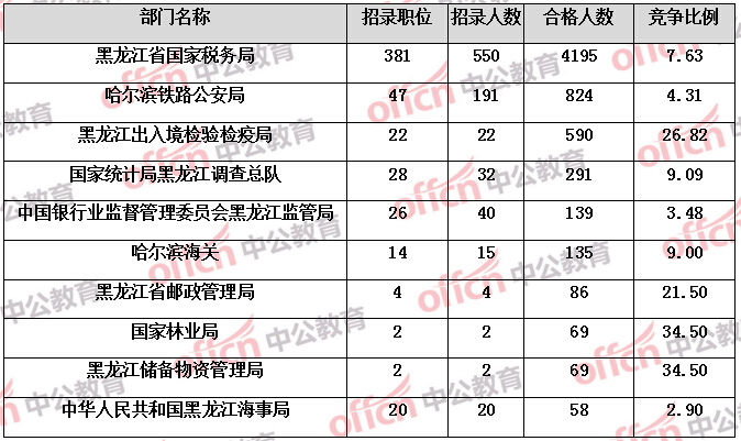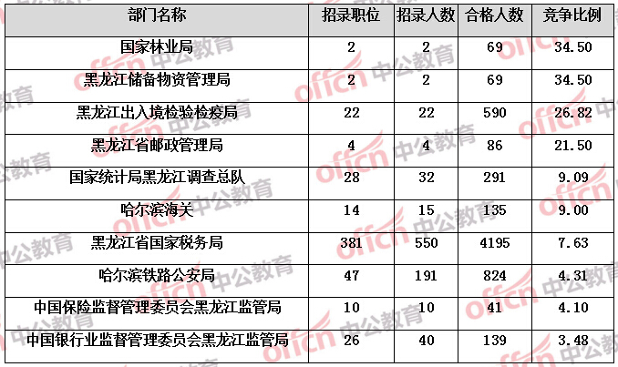 為幫助廣大考生更清晰的了解今日報名情況,黑龍江中公教育整理了審核通過人數(shù)前六位的部門以及競爭比例最激烈的十大部門,供廣大考生參考: