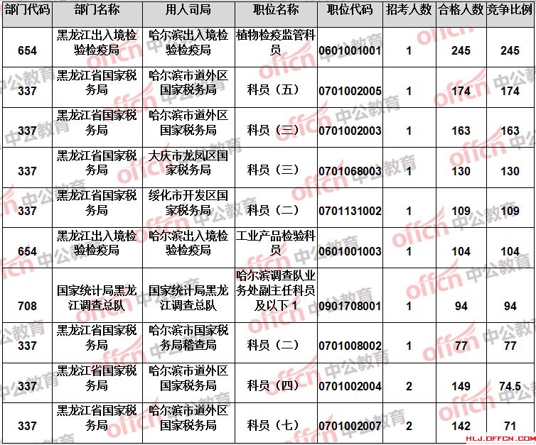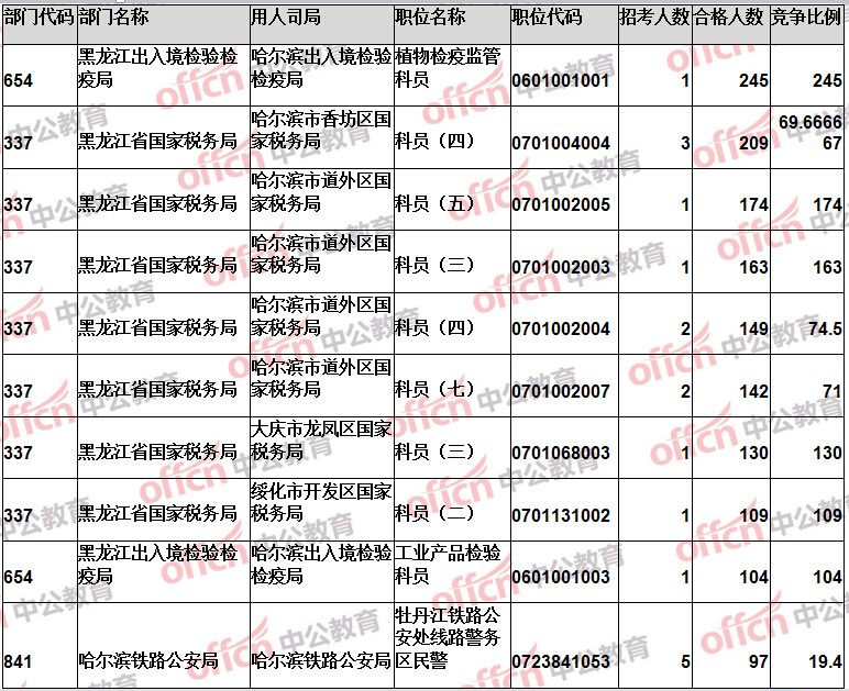 報名通過審核人數(shù)前十的職位主要集中在黑龍江省國家稅務局、黑龍江出入境檢驗檢疫局、哈爾濱鐵路公安局等部門,具體信息如下: