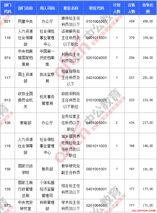 截止到18日16時(shí),競(jìng)爭(zhēng)比例的職位為民盟中央辦公廳接待處主任科員及以下一職,招錄1人,截止到18日16時(shí)合格人數(shù)為458人,再創(chuàng)北京市競(jìng)爭(zhēng)比例新高!