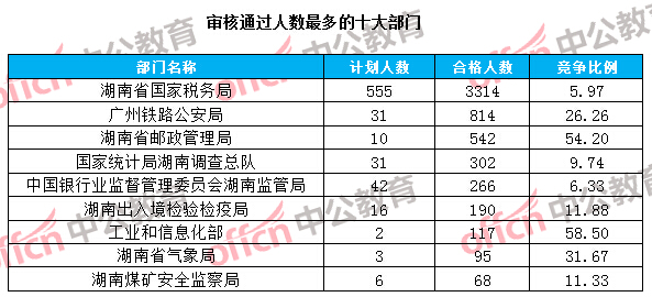 通過審核人數(shù)前三位的部門依次是:湖南省國家稅務(wù)局、廣州鐵路公安局、湖南省郵政管理局,三部門通過審核總?cè)藬?shù)為4670人,占通過審核總?cè)藬?shù)的80.13%。