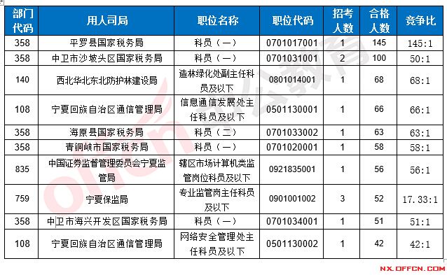截止到19日8時,競爭比例的職位為平羅縣國家稅務(wù)局科員(一)一職,招錄1人,截止到19日8時合格人數(shù)為145人,具體信息如下: