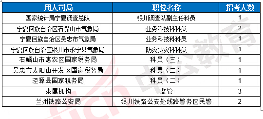 截止到19日8時,工作地點在寧夏的職位共有9個無人報考,占全部職位的8%。下面是無人報考職位一覽表,中公網(wǎng)校專家建議廣大考生多關(guān)注一些較冷職位,避免激烈競爭,結(jié)合自身條件,找到屬于自己的職位。