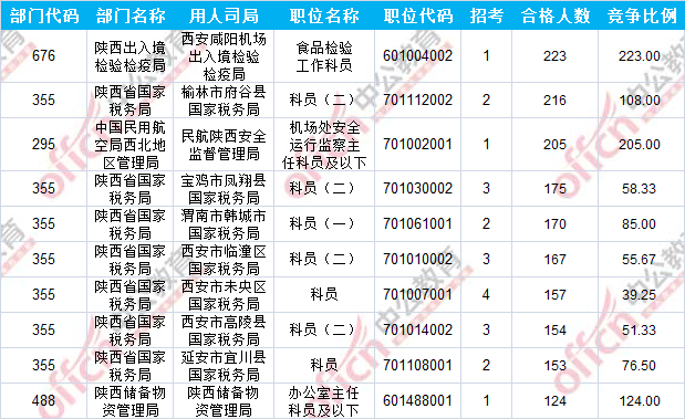 報名通過審核人數(shù)前十的職位主要集中在陜西出入境檢驗(yàn)檢疫局、陜西省國家稅務(wù)局、中國民用航空局西北地區(qū)管理局等部門,具體信息如下: