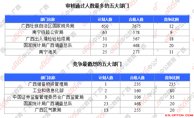 為幫助廣大考生更清晰的了解今日?qǐng)?bào)名情況,廣西中公網(wǎng)校整理了審核通過人數(shù)前五位的部門以及競爭比例最激烈的五大部門,供廣大考生參考: