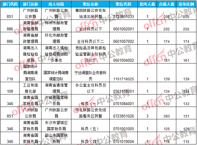 報名通過審核人數(shù)前十的職位主要集中在廣州鐵路公安局、湖南省郵政管理局等部門,具體信息如下: