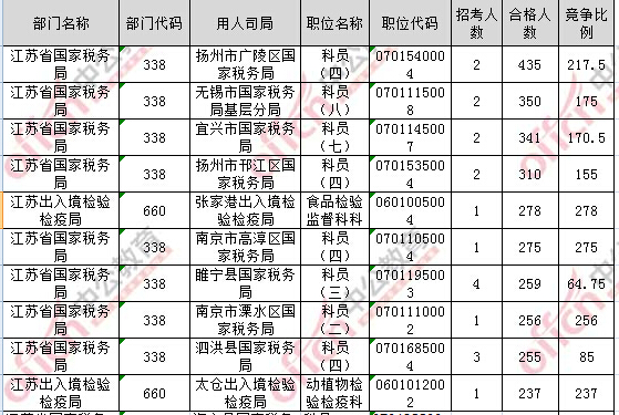報名通過審核人數(shù)前十的職位主要集中在江蘇省國家稅務(wù)局、江蘇出入境檢驗(yàn)檢疫局,具體信息如下: