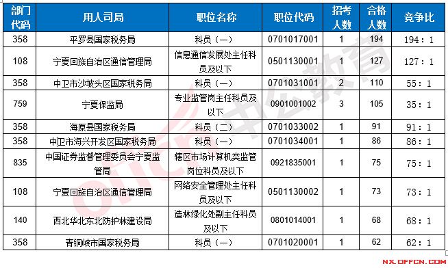 截止到20日8時,寧夏國考合格人數(shù)前三位的部門依次是:寧夏回族自治區(qū)國家稅務(wù)局、工業(yè)和信息化部、中國保險(xiǎn)監(jiān)督管理委員會寧夏監(jiān)管局。