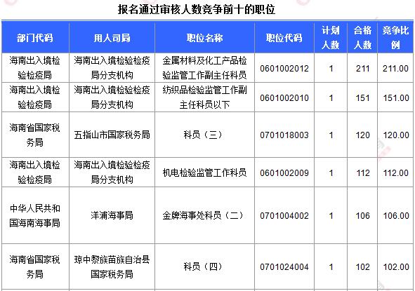 截止到20日8時,仍有21個職位無人報名,而熱門職位競爭卻是越來越激烈,其中報名人數(shù)最多的職位為:海南出入境檢驗檢疫局,金屬材料及化工產(chǎn)品檢驗監(jiān)管工作副主任科員,共報名211人,競爭比例已高達211:1!