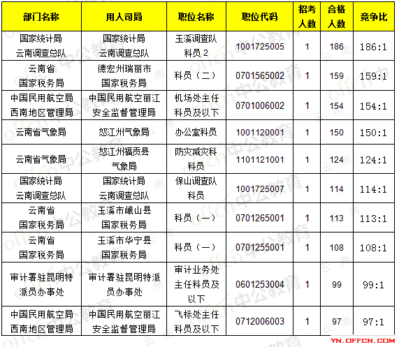 截止20日8時,招錄比例的職位為國家統(tǒng)計局云南調(diào)查總隊,職位代碼是1001725005,招錄7人,通過人數(shù)404人,競爭比186:1