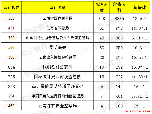 截止20日8時,通過審核人數(shù)前四位的部門依次是:云南省國家稅務局、云南省氣象局、中國銀行業(yè)監(jiān)督管理委員會云南監(jiān)管局、昆明海關,四部門通過審核總?cè)藬?shù)達 10369人,占通過審核總?cè)藬?shù)的87.4%。