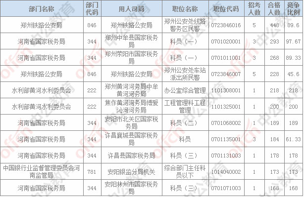 報(bào)名通過(guò)審核人數(shù)排名前列的職位主要集中在鄭州鐵路公安局、河南省國(guó)家稅務(wù)局,水利部黃河水利委員會(huì),具體信息如下: