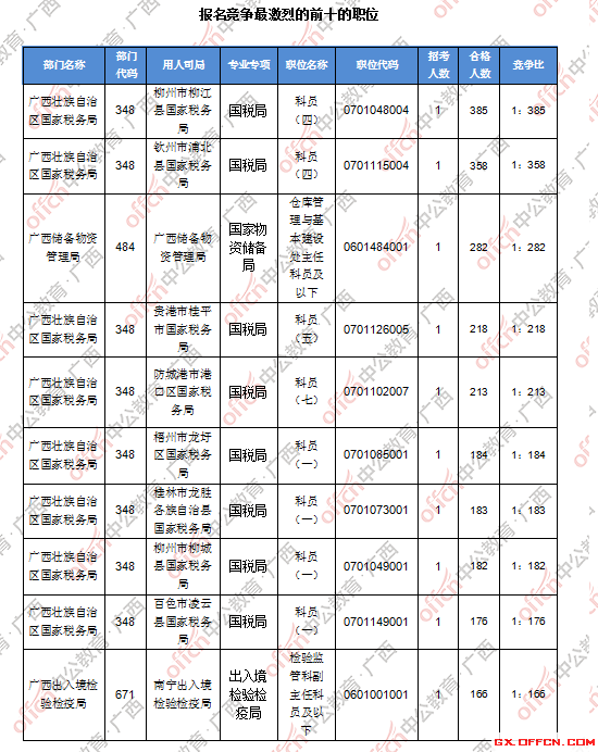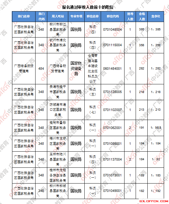 報(bào)名通過(guò)審核人數(shù)前十的職位主要集中在廣西壯族自治區(qū)國(guó)家稅務(wù)局、廣西儲(chǔ)備物資管理局等部門(mén),具體信息如下: