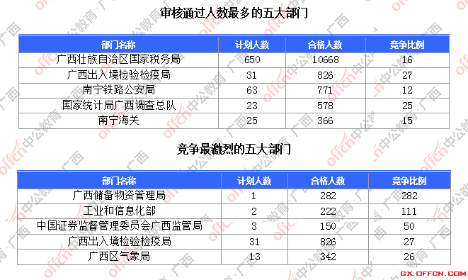 為幫助廣大考生更清晰的了解今日?qǐng)?bào)名情況,廣西中公網(wǎng)校整理了審核通過(guò)人數(shù)前五位的部門(mén)以及競(jìng)爭(zhēng)比例最激烈的五大部門(mén),供廣大考生參考: