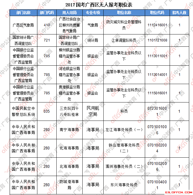 截止到20日16時(shí),工作地點(diǎn)在廣西的職位共有30個(gè)無(wú)人報(bào)考,占全部職位的4.7%。下面是部分廣西無(wú)人報(bào)考職位一覽表,更多無(wú)人報(bào)考職位詳情請(qǐng)下載附件,廣西中公網(wǎng)校專(zhuān)家建議廣大考生結(jié)合自身?xiàng)l件,根據(jù)自己的實(shí)際情況找到屬于自己的職位,避免激烈競(jìng)爭(zhēng)。