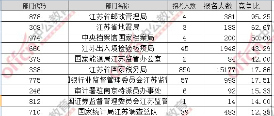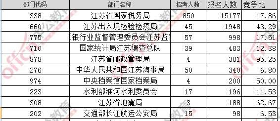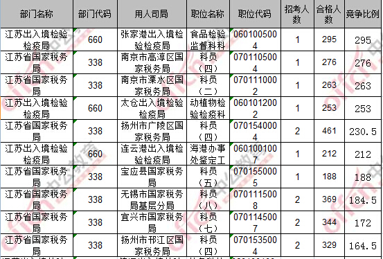 報名通過審核人數(shù)前十的職位主要集中在江蘇省國家稅務局、江蘇出入境檢驗檢疫局,具體信息如下: