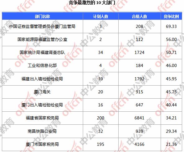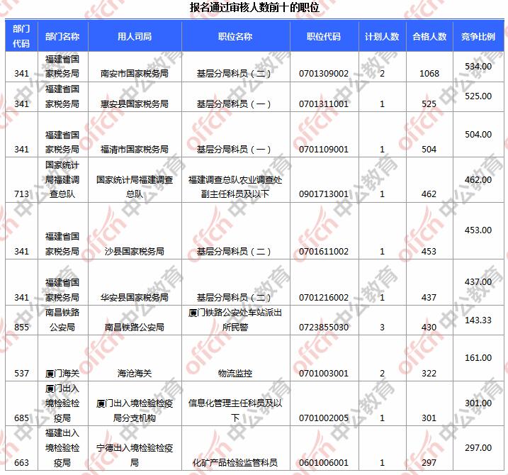 為幫助廣大考生更清晰的了解今日報名情況,福建中公網(wǎng)校整理了審核通過人數(shù)前10位的部門以及競爭比例最激烈的10大部門,供廣大考生參考: