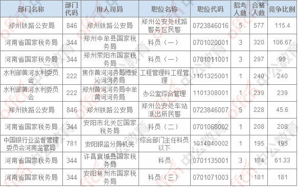 報名通過審核人數(shù)排名前列的職位主要集中在鄭州鐵路公安局、河南省國家稅務局,水利部黃河水利委員會,具體信息如下: