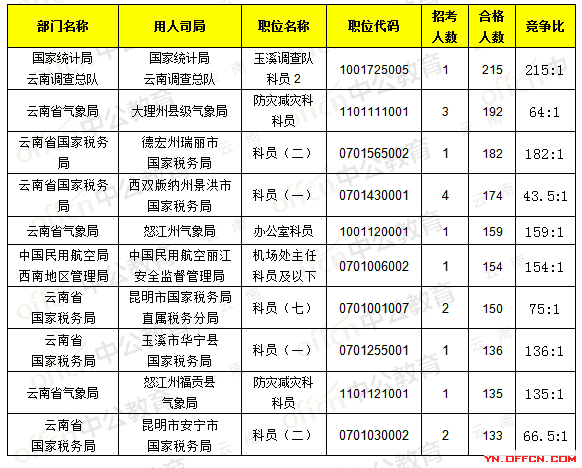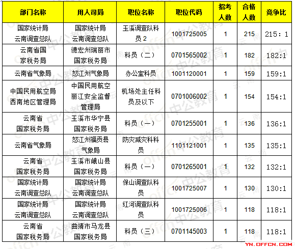 截止20日16時,競爭最激烈的職位為國家統(tǒng)計局云南調查總隊_國家統(tǒng)計局云南調查總隊(玉溪調查隊科員2),職位代碼1001725005,招錄1人,通過人數為215人,215:1。