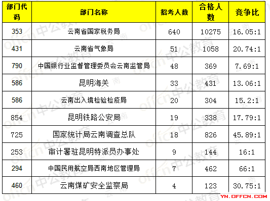 報名通過審核人數前十的職位主要集中在國家統(tǒng)計局云南調查總隊、云南省氣象局、云南省國家稅務局等部門,具體信息如下: