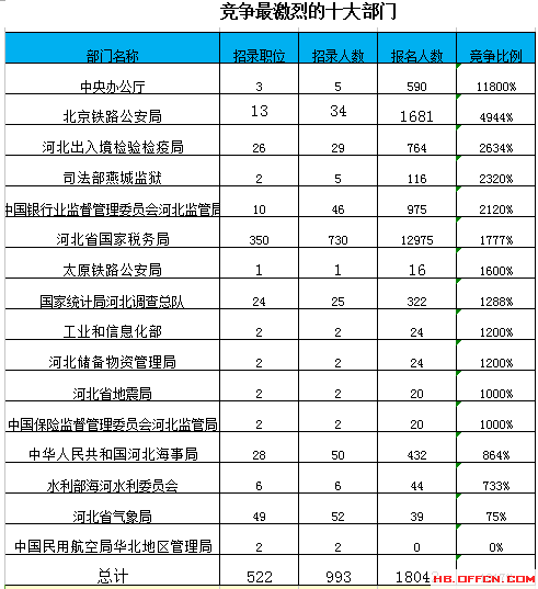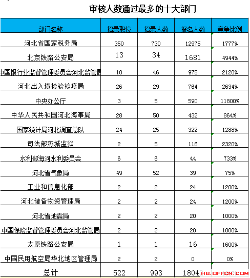 截止到21日8時(shí),通過(guò)審核人數(shù)前三位的部門依次是:河北省國(guó)家稅務(wù)局、北京鐵路公安局、中國(guó)銀行業(yè)監(jiān)督管理委員會(huì)河北監(jiān)管局,三部門通過(guò)審核總?cè)藬?shù)達(dá)15631人,占通過(guò)審核總?cè)藬?shù)的87%。