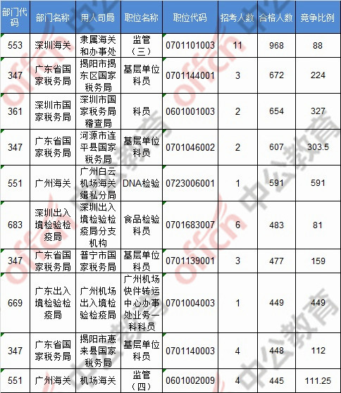 截止到21日8時,競爭比例的職位為廣州海關(guān)廣州白云機(jī)場海關(guān)緝私分局DNA檢驗一職,招錄1人,截止到21日8時通過人數(shù)為591人。