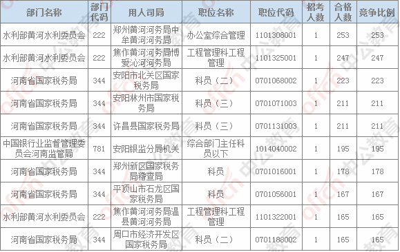 截止21日8時,招錄比例的職位為鄭州黃河河務局中牟黃河河務局辦公室綜合管理一職,招錄1人,截止21日8時通過人數(shù)為253人。